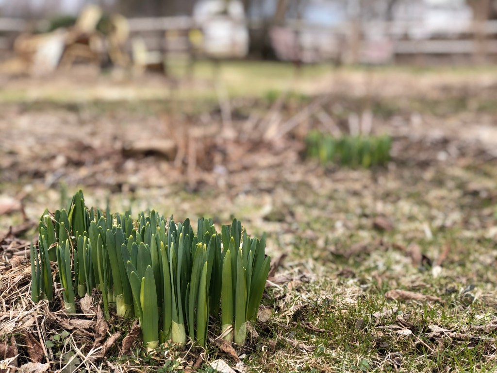 Shoots of daffodils are poking up. They’re already all over the place. We have about an acre of land, which used to be entirely lawn. Since we moved in, we let about a third of it go wild every year. Patches of daffodils are creating a beautiful patchwork of color in the sea of last year’s untrimmed grass. There are also circles of lily, iris, and peony shoots appearing in our flower gardens, along with something I can’t remember the name of.
