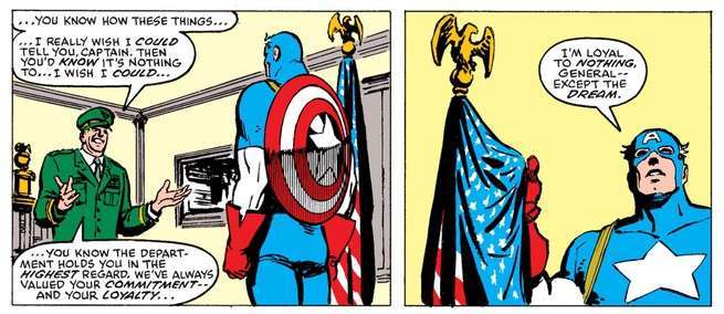 Cap is being confronted by a corrupt general, who suggests that our hero’s loyalty is appreciated by this military POS and his cohort. In response, Cap grasps the American flag in one hand and says, “I’m loyal to nothing, General – except the dream.”