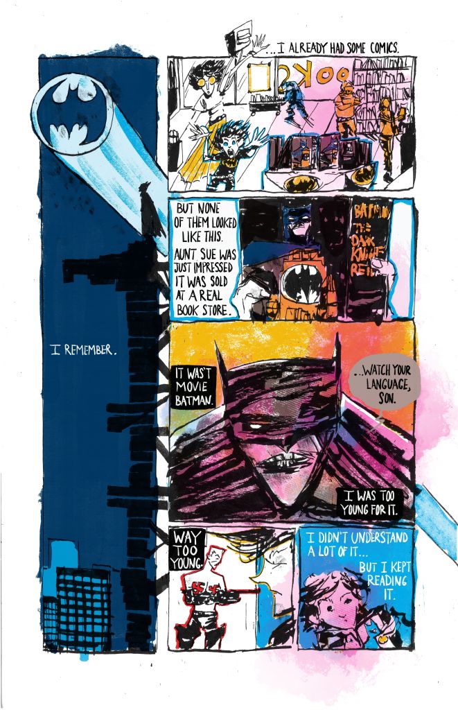 Thirty-two years later, there’s something in the air. Burton’s Batman is in the zeitgeist. DC Comics just started a Batman ’89 mini-series that picks up where Batman Returns left off. Michael Keaton is putting the cowl back on for the Flash movie that’s due out a little over a year from now. And just this evening, I was fortunate enough to see the work of Tony McMillen, a comic creator who shared his Batman Summer ’89 with the Cartoonist Kayfabe Facebook group.